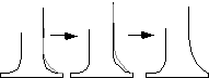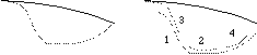 Au premier abord, on peut considérer que la transformation doit conserver le nombre et la position des points d'inflexion de f sur [0..A] [[union]] [B..Lf]. Cependant, cette condition ne peut être toujours vérifiée. De plus, notre technique d'interaction rend cette condition relativement inutile : elle encourage soit des marques de reparamétrisation importantes mais imprécises, soit des marques courtes et rapides, mais précises, qui commencent et finissent sur la courbe à reparamétrer, "tirant" progressivement la courbe vers la forme désirée (figure IV.4.3). Dans ce cas, les transitions entre f et nf sont minimes et les points d'inflexions sont conservés là où ils doivent l'être.