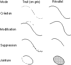 Une véritable application requièrerait l'introduction d'interacteurs reflétant mieux l'état courant de l'interface : soit en utilisant des widgets conventionnels, menus et palettes, soit des techniques plus avancées, comme des outils transparents [Bier, et al. 1993],[Bier, et al. 1994]. Nous pourrions aussi considérer des techniques de reconnaissance de gestes pour différencier automatiquement les gestes de suppression des gestes de modification, ou utiliser des informations contextuelles pour unifier les modes "Modification" et "Jointure". Cependant, il est important de préserver la possibilité de dessiner n'importe quelle forme de reparamétrisation, sans déclencher de jointure, ou supprimer un trait qu'on désire reparamétrer. Des modes clairement identifiés sont peut être dans ce cas le meilleur moyen d'éviter des conflits entre l'intention de l'utilisateur et l'interprétation du système. L'utilisation de modes peut se rapprocher de l'utilisation de différents instruments physiques que peut utiliser un graphiste : divers types de crayons, gommes, pinceaux... les fabricants de tablettes graphiques actuels, comme Wacom, fournissent à l'heure actuelle divers types de stylets permettant de reproduire une interaction avec des objets physiques proche de l'environnement de travail des graphistes, et à même de refléter au mieux les différents modes d'un outil de dessin informatique.