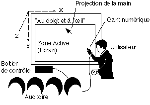 Nous utilisons ce système pour assister la présentation interactive (Figure VI.1.1). Un rétroprojecteur reproduit l'écran de l'ordinateur sur un panneau de projection. Le présentateur (notre utilisateur) porte le gant numérique et se sert de commandes gestuelles pour diriger sa conférence. Bien que le système capte tous les gestes de l'utilisateur, celui-ci reste libre d'interagir dans le monde réel, pour communiquer ou utiliser d'autres appareils. En effet, les commandes sont interprétées par le système seulement si :