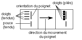 Une commande gestuelle est représentée par un bloc de trois icônes, représentant respectivement la posture de début de geste, la dynamique du geste et la configuration de fin de geste qui déclenche l'exécution de la commande. Cette dernière est optionnelle, car la commande est exécutée dès lors que l'utilisateur, ayant commencé une commande, cesse de désigner la zone active (en abaissant son bras, par exemple). Les icônes de début (resp. de fin) de geste représentent la posture qui doit être adoptée par la main pour que le système débute (resp. termine) la reconnaissance d'un geste. Cette posture est schématisée. En effet, comme nous l'avons indiqué précedemment, les dimensions gestuelles utilisées pour l'analyse des postures sont discrétisées. Au lieu de considérer l'angle des articulations et l'orientation du poignet comme des valeurs variant continûment, seules 4 valeurs de flexion pour chaque doigt (2 pour le pouce) et 7 valeurs d'orientation du poignet sont prises en compte. Ces valeurs sont notées par les symboles suivants (Figures VI.2.1 et VI.2.2) :