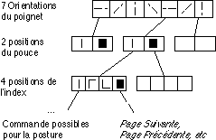 * Segmentation : ces dimensions sont affectées à la segmentation des gestes (postures de début et de fin de geste). Afin de rendre les postures plus reconnaissables par l'utilisateur et plus faciles à reconnaître par le système, ces dimensions sont discrétisées : nous considérons 7 orientations du poignet, 4 niveaux de pliure pour chaque doigt et 2 pour le pouce. Il existe ainsi en théorie 3584 postures identifiables par le système. Parmi celles-ci, les contraintes articulatoires de la main limitent à environ 300 les postures réalisables sans contorsions exagérées, dont 30 à 80 sont effectivement utilisables dans une interaction courante.