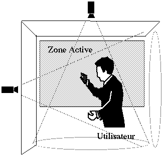 Afin de pouvoir distinguer les gestes adressés au système de ceux concernant l'environnement, notre modèle requiert la définition de zones actives. Ces zones sont des surfaces en deux dimensions, par exemple la projection d'un écran d'ordinateur sur un mur. Les gestes ne sont interprétés que si l'utilisateur désigne une zone active, c'est-à-dire que la projection de son poignet dans la direction du bras sur le plan défini par la zone active intersecte la surface délimitée.
