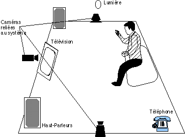 Une application plus lointaine de Charade pourrait être le remplacement des télécommandes et contrôles à distance par une interaction gestuelle à distance dans un environnement domotique (figure VI.4.3). Un certain nombre de caméras judicieusement placées permettent de définir des zones actives pour tous les objets activables à distance. Il devient ainsi possible d'actionner les divers appareils électroménagers tels que le système audio-vidéo, la lumière, les rideaux, sans ce déplacer ni s'encombrer d'une télécommande.